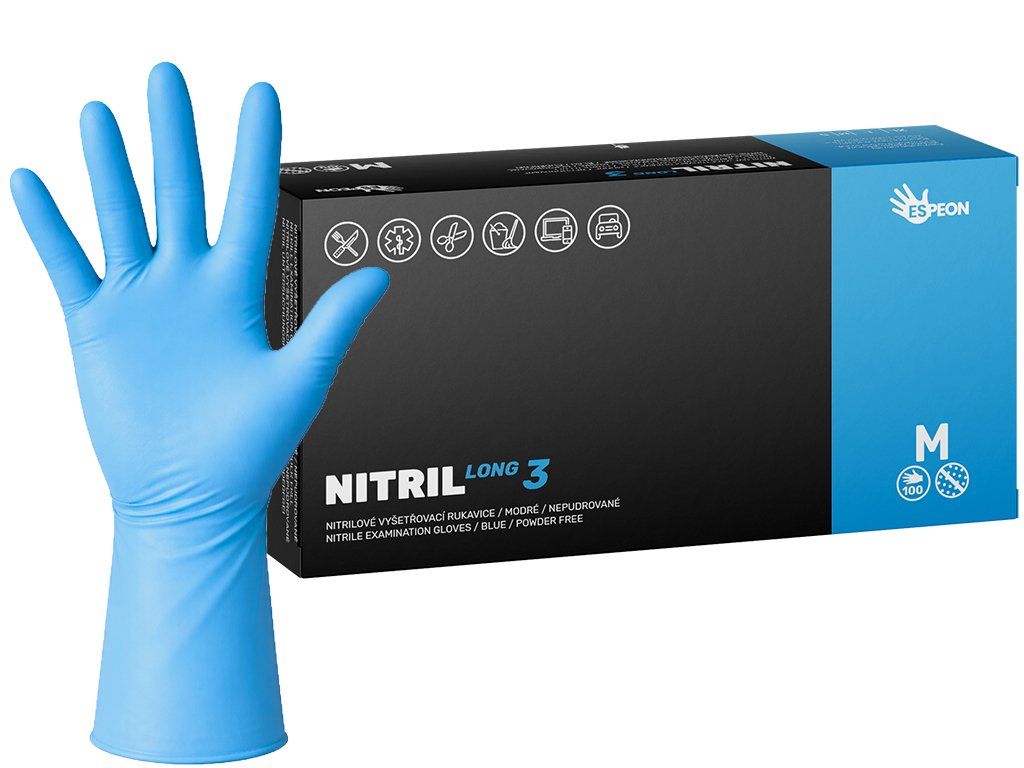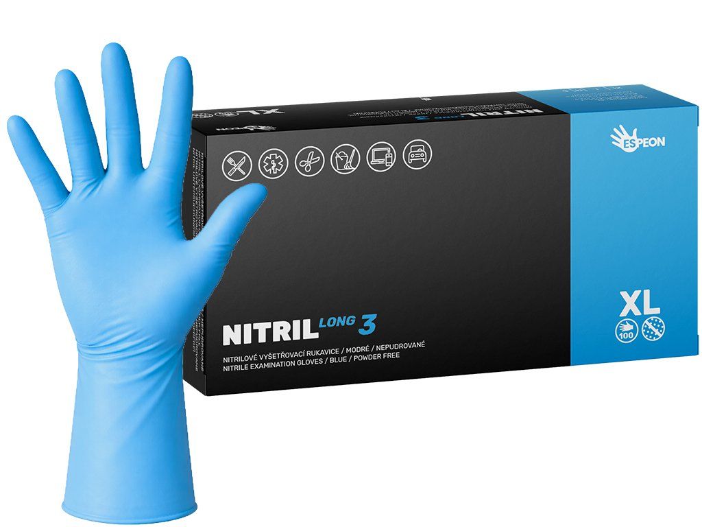 Nitrilové rukavice NITRIL LONG3 100 ks, nepudrované, modré, 6.2 g