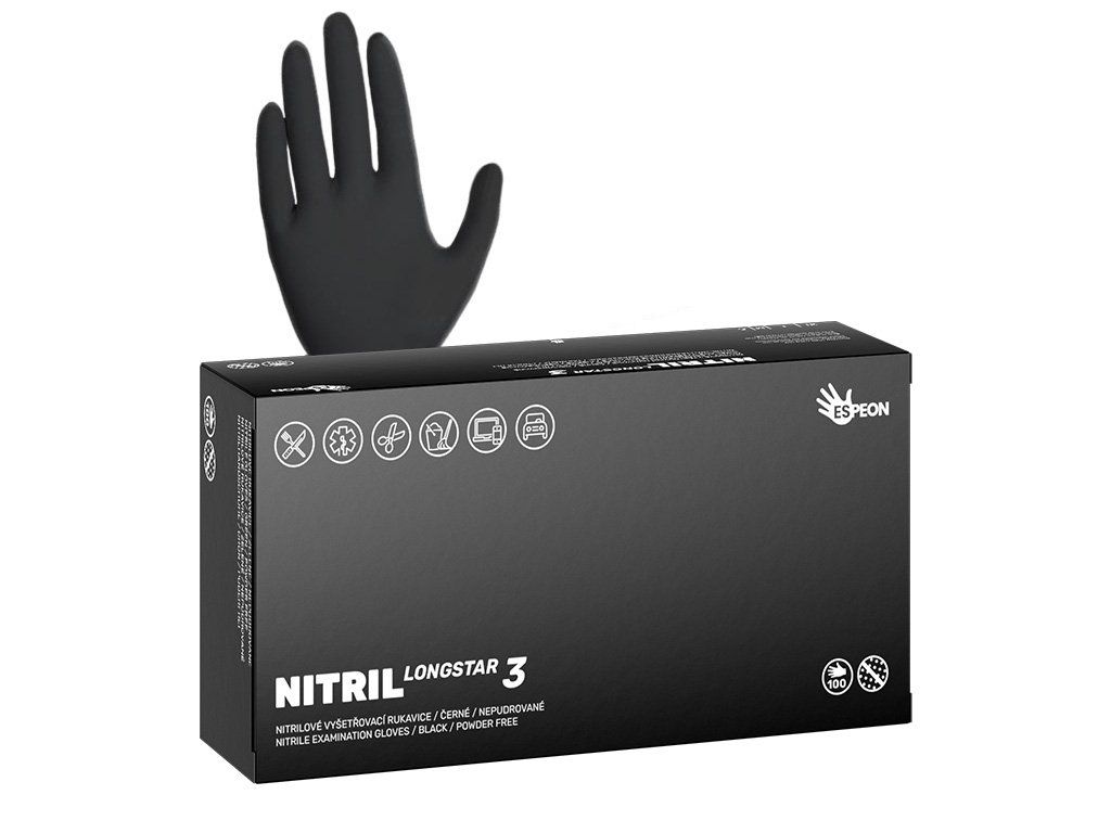 Nitrilové rukavice NITRIL LONGSTAR3 100 ks, nepudrované, čierne, 11.4 g – krabička s drobnou chybou